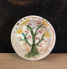 Kaffeekanne, Trinkschale, Butterplatte, Zuckerdose, Seifenhalter, Kerzenleuchter – die Töpferin (*1995) mit Atelier in Buxy/ Burgund kreiert Tonware für den Alltag. Bevorzugt greift sie auf altvertraute Formen zurück, wie die Ohrenschüssel für den Milchkaffee zum Frühstück und den prachtvollen Maskenkrug für den Wein am Abend. Spontanität zulassend, verleiht sie ihren Fayencen einen unverwechselbaren Charakter. Ihre Malerei strahlt eine Farbigkeit und Frische aus, dass der Tag mit ihrem Geschirr nicht langweilig werden kann.