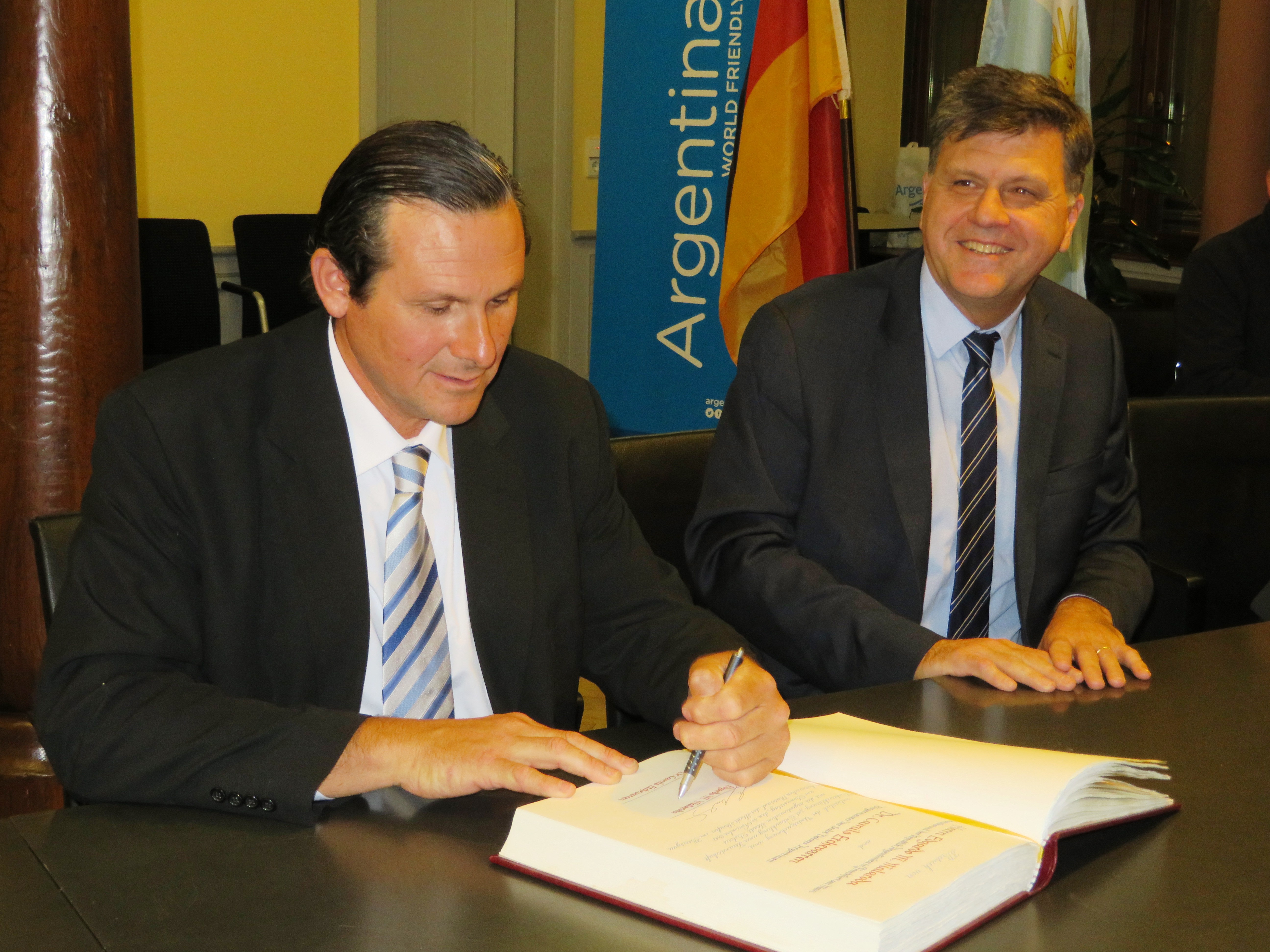 Am 30. November fand nun im Beisein von Generalkonsul Malaroda, den beiden Bürgermeistern Dr. Camilo Etchevarren und Michael Benitz, den Fraktionsvorsitzenden des Staufener Gemeinderats, Mitarbeitern des argentinischen Generalkonsulats, Herrn Joachim Baar vom Vorstand des Tango und Bandoneon e. V. sowie ehemaligen argentinischen Bürgerinnen, die nun hier in der Raumschaft leben, die feierliche Unterzeichnung der Absichtserklärung statt.