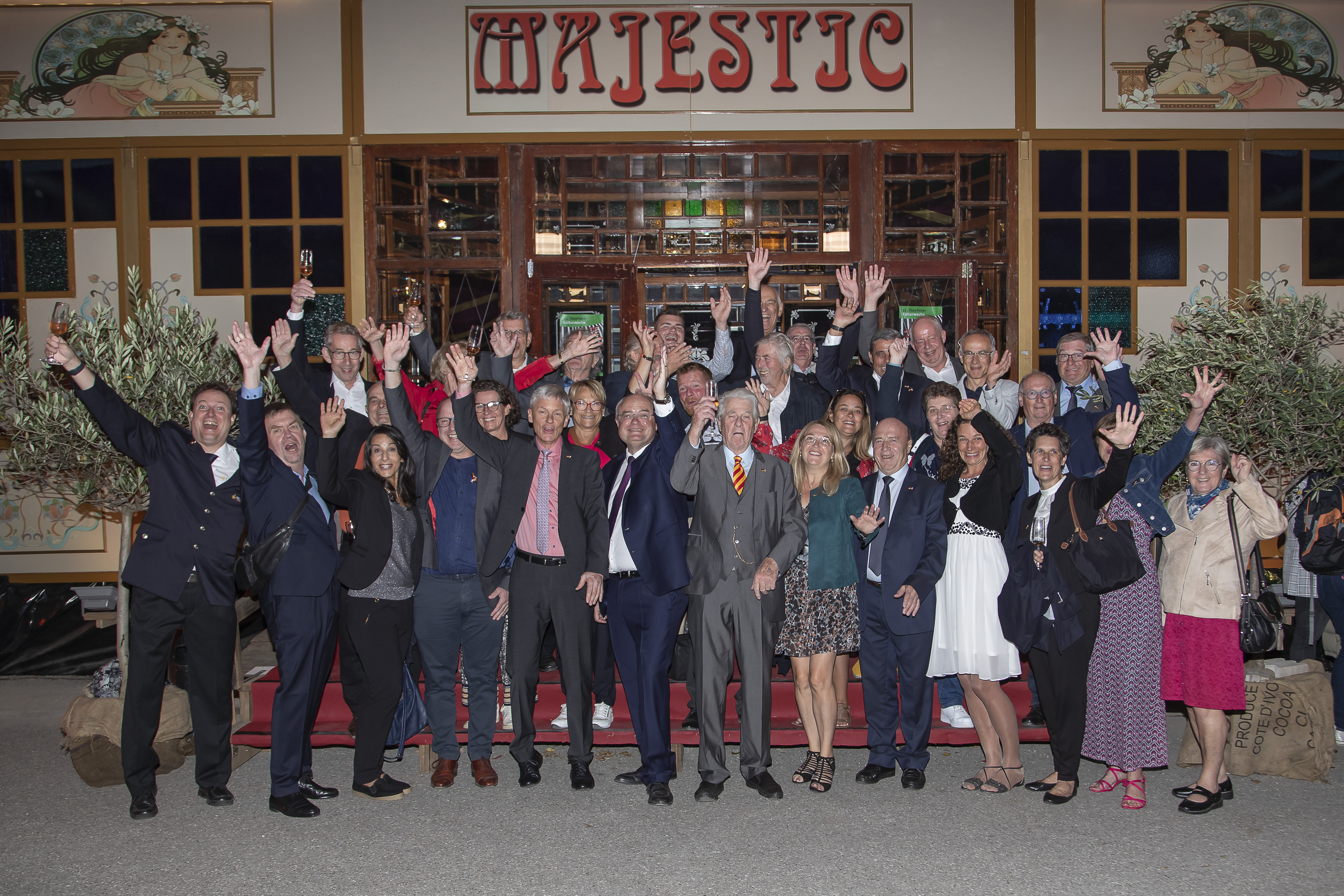 Am Samstagvormittag traf die rund 60-köpfige Delegation aus Bonneville ein. Bürgermeister Stéphane Valli mit seiner Ehefrau Frédérique wurden von Mandatsträgern und Gemeinderäten, 20 Musikern der Harmonie "Echo l'Arve" sowie Vertretern der Freiwilligen Feuerwehr, des Chores "Chorale de l'Arve", des Radsportvereins, der "Comapgnons de Savoie" und des Partnerschaftsausschusses begleitet. Unter den Gästen aus Frankreich waren außerdem die international bekannten Musiker Dimitri und Julien Bouclier, die mit ihrem meisterlichen Spiel auf dem Akkordeon und der Geige das ganze Wochenende über immer wieder begeisterten. Auch eine vierköpfige Delegation aus unserer polnischen Partnerstadt Kazimierz Dolny hatte sich auf den weiten Weg nach Staufen gemacht, um mit uns zu feiern.