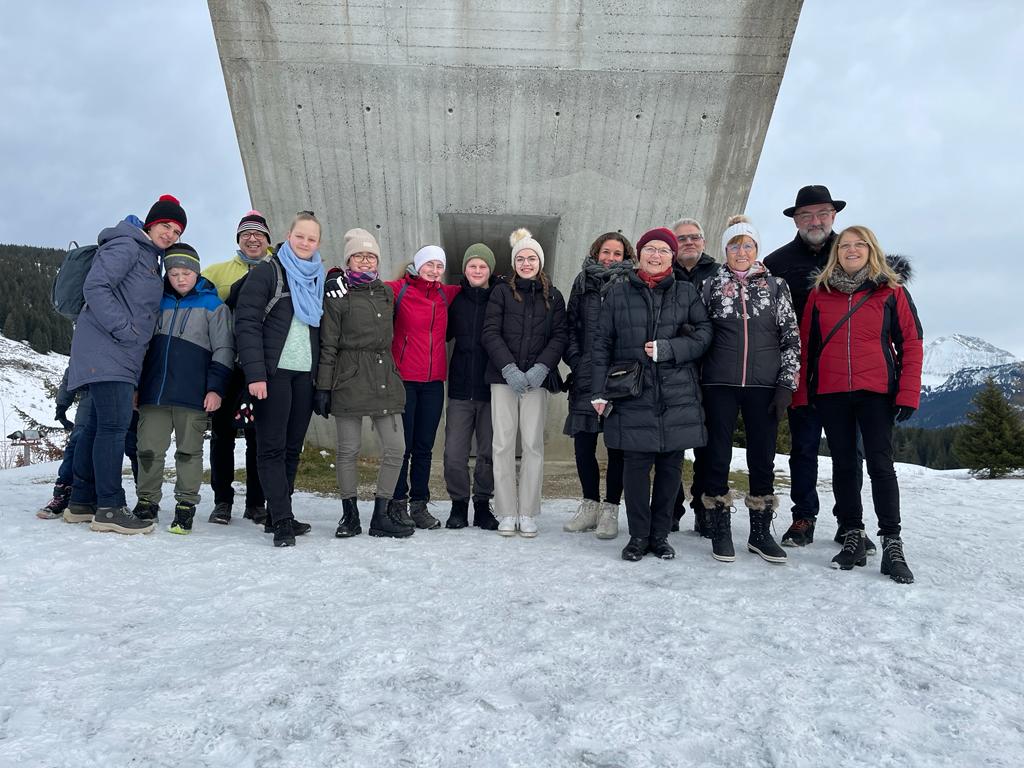 Begleitet wurde die Gruppe von einer Delegation des Partnerschaftsausschusses Bonneville. Patrick Weichert, Vorsitzender des Partnerschaftskomitees Bonneville, hatte für das Wochenende ein buntes Programm zusammengestellt. Einen Höhepunkt bildete der Ausflug zum schneebedeckten „Plateau des Glières“ (1.450 m. ü.M), auf welchem ein nationales Monument zum Gedenken an eine Schlacht im März 1944 zwischen der französischen Widerstandsbewegung, der Résistance, gegen die deutsche Wehrmacht und die mit ihr verbündeten Milizen des Vichy-Regimes. Alle Teilnehmer und im Besonderen die Jugendlichen, konnten so auch die leidvollen Facetten der gemeinsamen deutsch-französischen Geschichte hautnah eindrücklich erleben. Der Abschluss des Besuchs erfolgte in einem gemütlichen Bergrestaurant. Nach erfolgter Stärkung mit lokalen Spezialitäten aus den Savoyen erfreuten die Jungmusiker alle anwesenden Gäste mit einem spontanen „Hüttenkonzert“, wo sie erneut einen Beweis ihres außergewöhnlichen Könnens liefern konnten.
