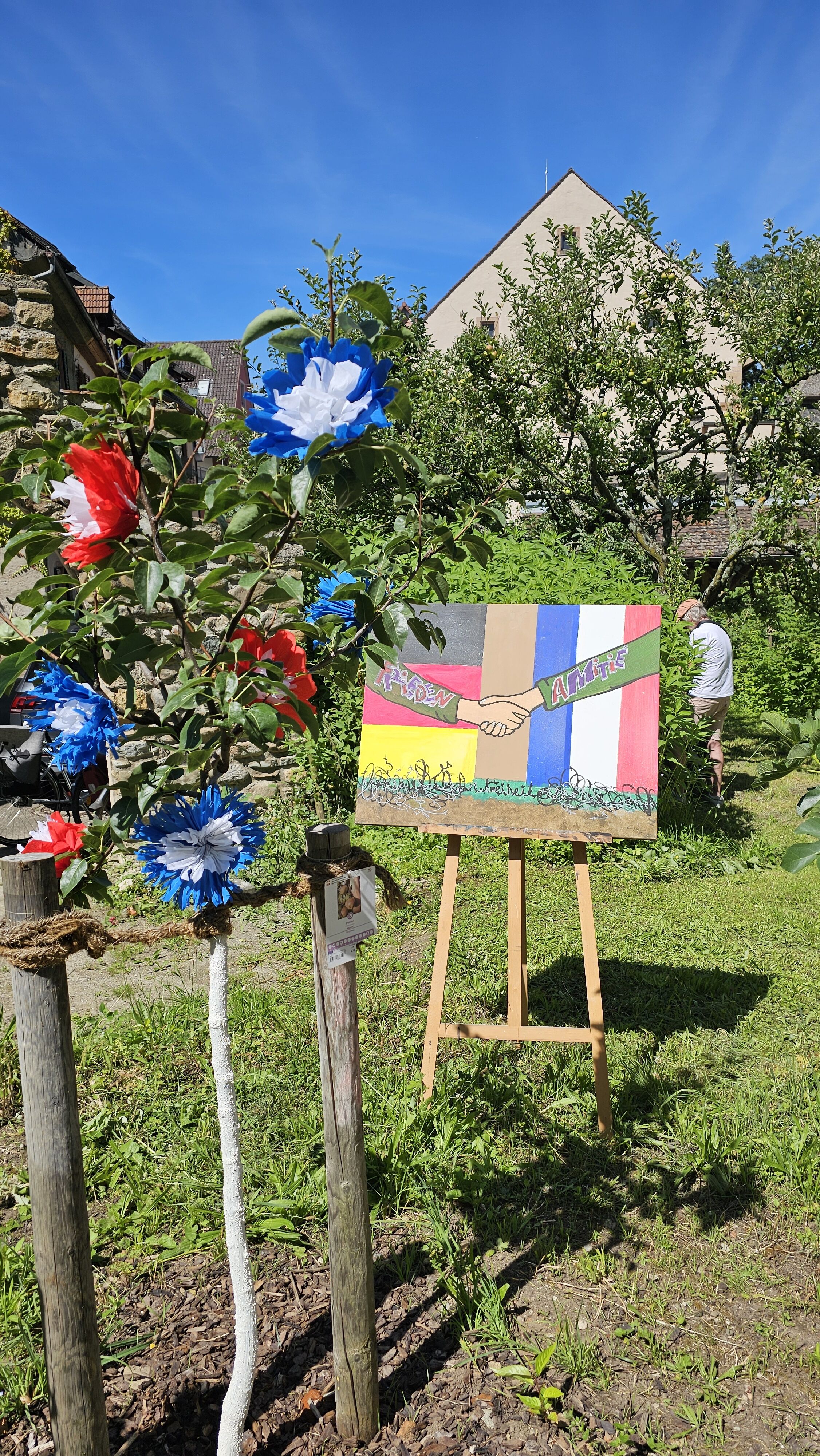 Géraldine Coffy, Vorsitzende des „Comité de jumelage“ sowie stellvertretende Bürgermeisterin von Bonneville, und ihr Ehemann Christophe Villain waren zum Anlass der Einweihungsfeier aus Bonneville angereist. Das reichhaltige Buffet mit dem sehr beliebten „Reblochon“ (einem französischen Weichkäse), ein Gläschen „Ayze“ aus Bonneville, strahlender Sonnenschein sowie die Dekoration in den französischen Nationalfarben, bildeten den Rahmen für die gut besuchte Einweihungsfeier. Der Staufener Schlossgarten, liebevoll gepflegt vom Förderverein Stadtgärten e. V., trug mit seinen schattenspendenden Apfelbäumen zu der malerischen Atmosphäre bei. In deutscher und französischer Sprache wurde in der Rede (gehalten von Monia Mainberger und Lucie Margerit, einer Abiturientin aus Bonneville) die Symbolik des Baums für die gut gepflegte und weit verzweigte Städtepartnerschaft hervorgehoben.