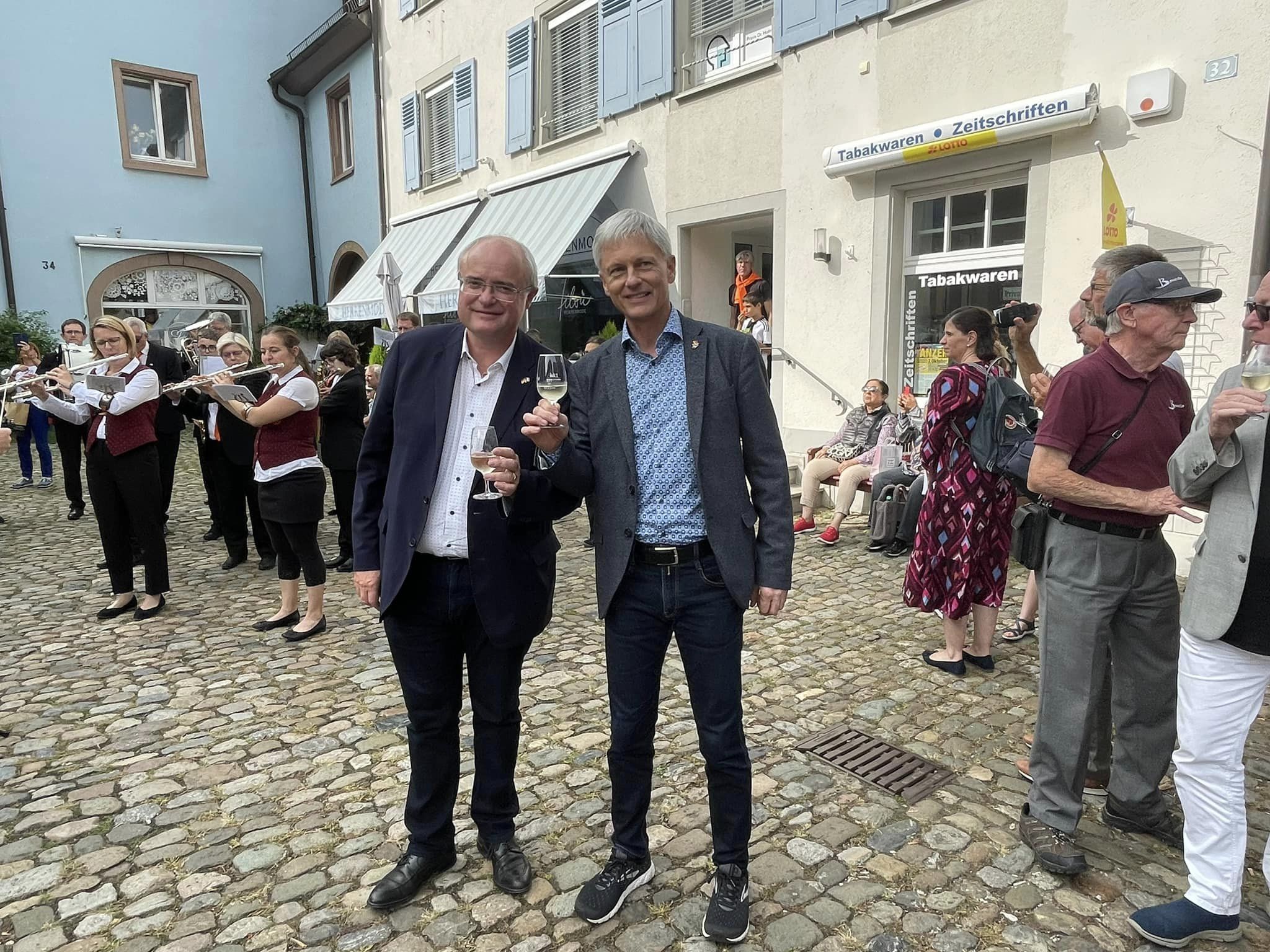 Nach einem ersten herzlichen "Hallo, ça va?" am Bus der Gäste durch den Partnerschaftsausschuss und Bürgermeister Michael Benitz ging es weiter zur offiziellen Begrüßung und einem Mittagessen in den Gewölbekeller des Weinguts Landmann. Von dort aus führten die Musikerinnen und Musiker der Stadtmusik Staufen und der Harmonie aus Bonneville die Gesellschaft in einem musikalisch begleiteten Festzug zum Kronenbrunnen, wo bei einem kleinen Platzkonzert der beiden Musikvereine auch die Bevölkerung dazu eingeladen war, mit einem Glas Gutedel auf die 60-jährige Städtepartnerschaft anzustoßen. Weiter ging es ins Staufener Alemannenbad. Dort hatte der Förderverein schon Kaffee und Kuchen vorbereitet und es gab für die Bonneviller Gäste ein Wiedersehen mit den "Clarinets for Staufen" unter der Leitung von Nicole Krüger, die im Januar bereits beim Neujahrsempfang der Stadt Bonneville aufgetreten waren. Danach hieß es die verschiedenen Unterkünfte beziehen und sich für den großen Jubiläumsabend im Spiegelzelt vorzubereiten.